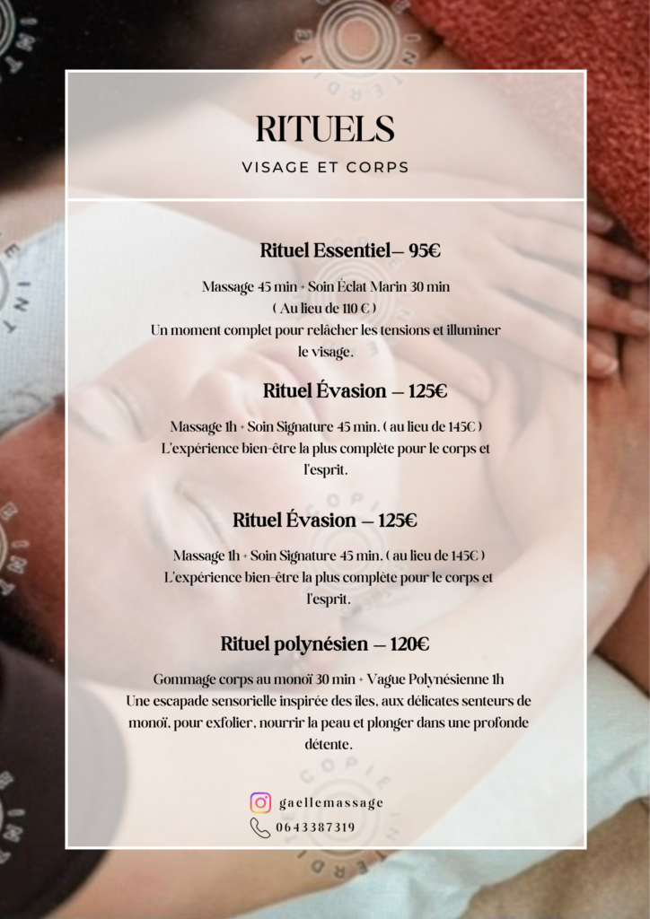 Je travaille depuis maintenant 5 ans dans le monde du bien être et du massage dans les spa et thalasso et j’ai décidé de me lancer à mon compte afin d’apporter un peu plus de moi dans ma prise en charge avec le client. Un vrai temps que je pourrais leur consacrer rien qu’à eux.J’ai toujours été attirée par l’univers de la santé, du bien être et du développement personnel qui m’a été inculqué très tôt. Ma mère étant dans le domaine de la santé et de la prévention, elle m’a massé toute mon enfance et adolescence. Ma grande mère avait sa propre pharmacie. Et ma marraine étant thérapeute corporelle.