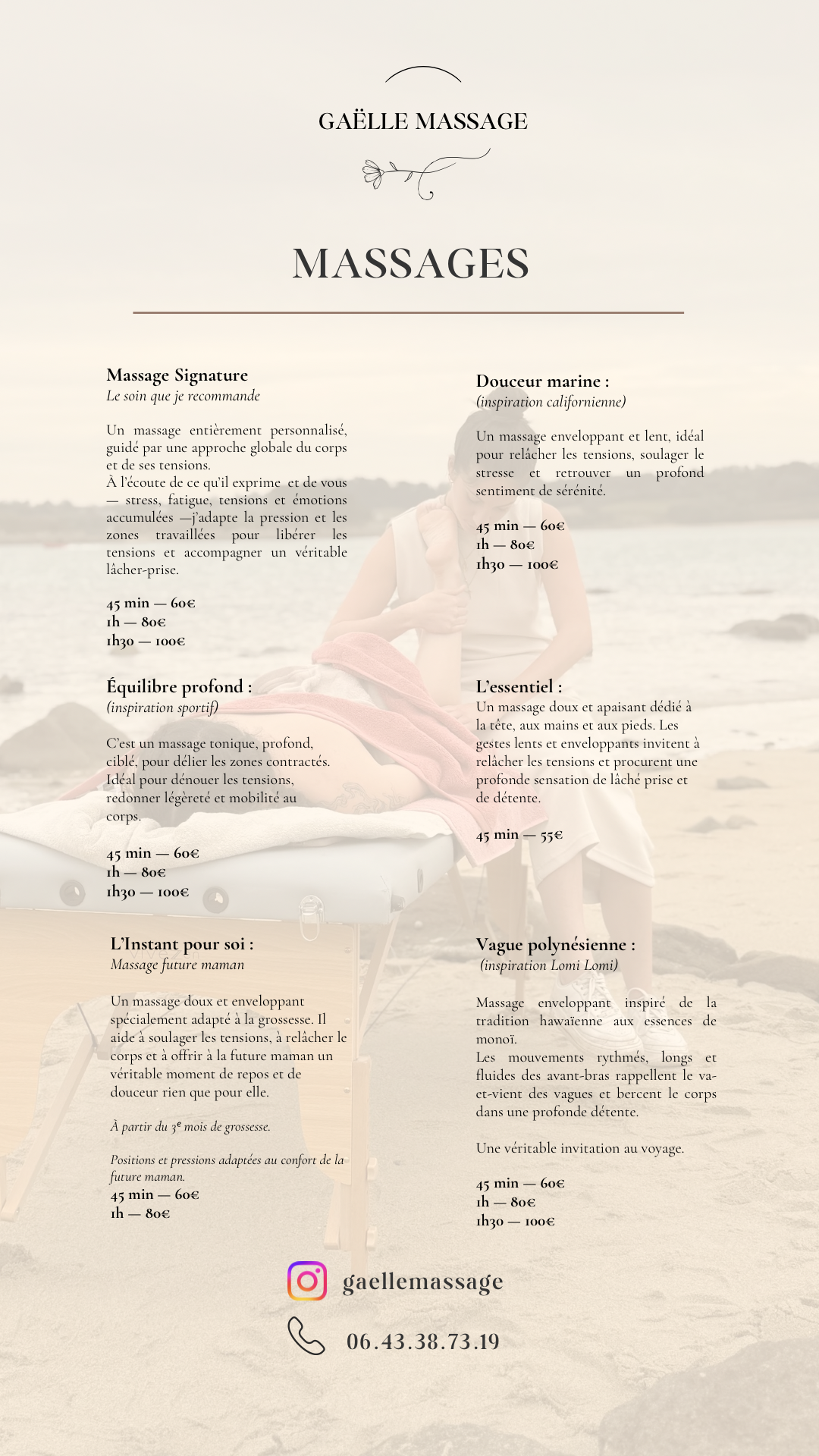 Procurer un vrai lâcher prise et une détente complète à mes clients. Leur apporter un moment rien qu’à eux, afin qu’il se sente mieux dans leur corps et leur esprit.Et ceci est un blabla pour que le texte arrive à prendre l’image en entier sur la hauteur. Et je rajoute du texte random pour qu’on arrive tout pile